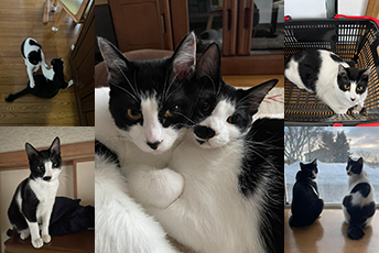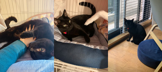 しっぽの会の皆様、こんにちは。クロを譲っていただいて3週間が経ちました。初日はご飯も水も摂らず、心細そうにしており心配しましたが、そのうち新しい環境に慣れ、今では食欲旺盛すぎてびっくりするほどとても元気です。少し目ヤニが出ていて毎日目薬をさしていますが、引っ搔いたり嚙んだりせず大人しく点眼もさせてくれて、とてもお利口さんです。撫でられたり、抱っこされるのが好きと伺っていましたが、撫でると気持ちよさそうにすぐグルグル言い、撫でるのをやめると「撫でてー」と鳴いて催促してきます。これからもクロと穏やかに楽しく生活していきたいと思っています。また3か月後にご報告します!
