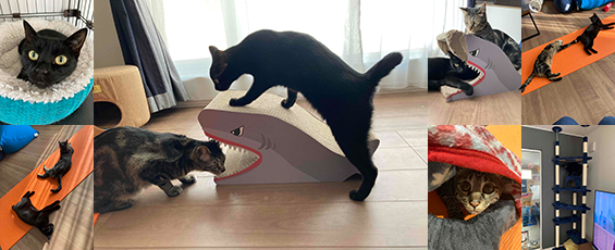 スピルとピルカを我が家に迎えて2週間が過ぎました。どちらも元気に過ごしてます!迎えた初日は緊張している様子で固まっていました。翌日には、2匹で一緒のハンモックに寝てました。3日目には、部屋の様子に慣れてくれた様子で、猫じゃらしで一緒に遊んだりしてました。スピルは、布を食べてしまうかもしれないと思い、スピル用のタイルカ-ペットのハンモックを準備してましたが、いまは、ピルカの布のハンモックで寝ていることが多く、布を食べてる様子もないです。私は猫と生活するのが初めてで、知らなかった発見も多く、猫の魅力にどんどん惹かれてます。我が家には、しっぽの会卒業犬の聖とピリカも居て、いまは部屋を別にしてるので猫と犬が一緒に居ることはないですが、いつか、犬猫仲良く過ごしてる様子が見れたら嬉しいなと思ってます。スピルとピルカ、我が家に来てくれてありがとう。