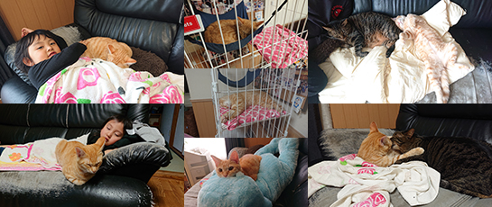 ご飯の後は顔中ご飯だらけなので、いつも時間をかけて拭くので嫌がるけど(これをしないとカブレます)、それでも爪を立てたり噛みつくこともシャーーーッ!!ということもなく、お腹を見せてゴロゴロと甘え、時にはよだれ一杯の顔で私の顔に突進してくることもあり、本当に可愛い子です(さらに親バカ)。最近は災害が起きても困らないように、むぎ用のご飯10日分を常にストックしています。私の実家の母と姉にも大人気で、高齢で笑顔が減った母が満面の笑顔になり、二人で「カワイイ、カワイイ」とベタ惚れです。来た当初よりも寝ていることが増えたのは、年相応のことなのかな。ここでスヤスヤ寝ているだけでも愛しくて可愛いむぎ、ずっとこのまま元気でいてほしいと願っています。