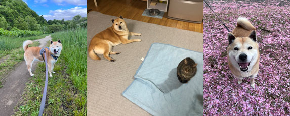5月7日にさくらを迎え入れてから、3週間が経過しました。初めの数日間は落ち着かない様子で、小さな物音にも起き上がってウロウロしていたさくらですが、今ではすっかり落ち着いてリビングの真ん中でくつろいでいます。誰にでも愛想がよく、いつも笑顔のさくらは散歩中も「あら、笑っているの~ご機嫌ね~」と声を掛けられる事も多いです。北海道犬なので、他の犬とやり合うのでは…と心配していましたが、小さい犬ともきちんと挨拶出来ています。我が家には先住猫が2匹いるのですが、最初の頃は全力で突撃して猫達にシャーシャー言われていました。今は程よい距離感を保って、同じ空間でお互いにくつろいでいます。時々匂いを嗅ぎ合ったりしているので、時間が経ったらもっと仲良くなれるのでは、と考えています。この3週間で随分と落ち着きも出て来ました。また、自我も出るようになってきて、先日目薬をさした時はムキっとなっていました。これから信頼関係を築いて、お互いを知っていきたいと思っています。家人に既に「ゆうこ」が居たため「さくら」に改名したのですが、まだピンと来ない様子です。これからたくさん名前を呼んで可愛がってあげたいです。可愛いさくらを迎え入れる事が出来て、毎日とても楽しく過ごしています。スタッフの皆様、これまでさくらにたくさんの愛情を注いで下さって本当にありがとうございました。