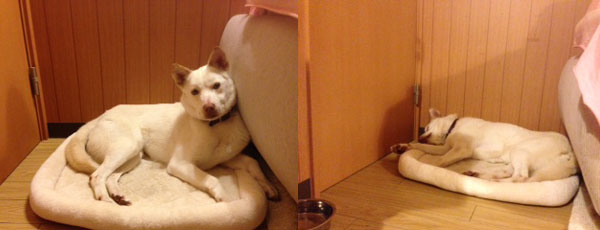 それからは、リビングの座布団に鎮座しています。不安からか、緊張しつつも私たちや先住犬のラルフの近くにいたいようです。