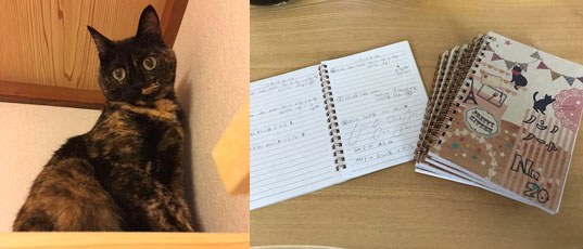 こころ(旧ティップ)家の子になり1年が経ち、ささやかですがケーキでお祝いしました。日々の様子を書き留めた「ここちゃん日記」も2冊め突入です!