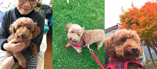 モネを迎えて一ヶ月半過ぎました。クララとの落ち着いた生活から一変して目まぐるしい毎日です。最初は、落ち着かないのか、くるくると家の中で回っておりました。その後は、おしっこをあちこちでしたり走り回っておりました。最近やっと少し落ち着いてきました。シニア検査をして、甲状腺低下と血糖値が下がっていてインスリンが出やすい状態で、お薬を二種類飲み始めました。首を苦しそうにしていたのがなくなり、首輪でも大丈夫になりました。家に来てからは、全然吠えないし、夜は、私の布団の中にもぐって寝ております。一日でも長くモネと一緒にいられるように食生活、健康に気をつけて過ごしていこうと思います。縁があって、モネを迎えて本当に良かったと思っております。ありがとうございました。