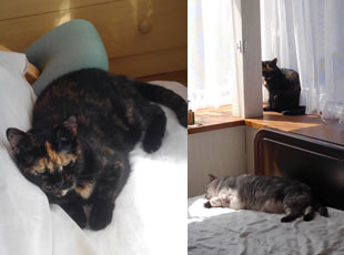 。決して暖かくはないのですが、出窓に置いたベッドで丸くなって寝ています。一番暖かいところに寝床を作ったのに、そこは一切寝ないので出窓にベッドを置きました。)
