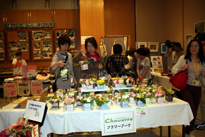 昨年に続き、フラワーショップ「シュエット」さんから、ミニブーケをたくさんご提供いただきました。 いつも人気のお品で完売です。 |