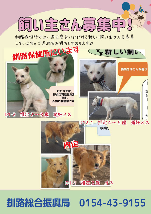 釧路保健所では3頭の犬が収容されています。
