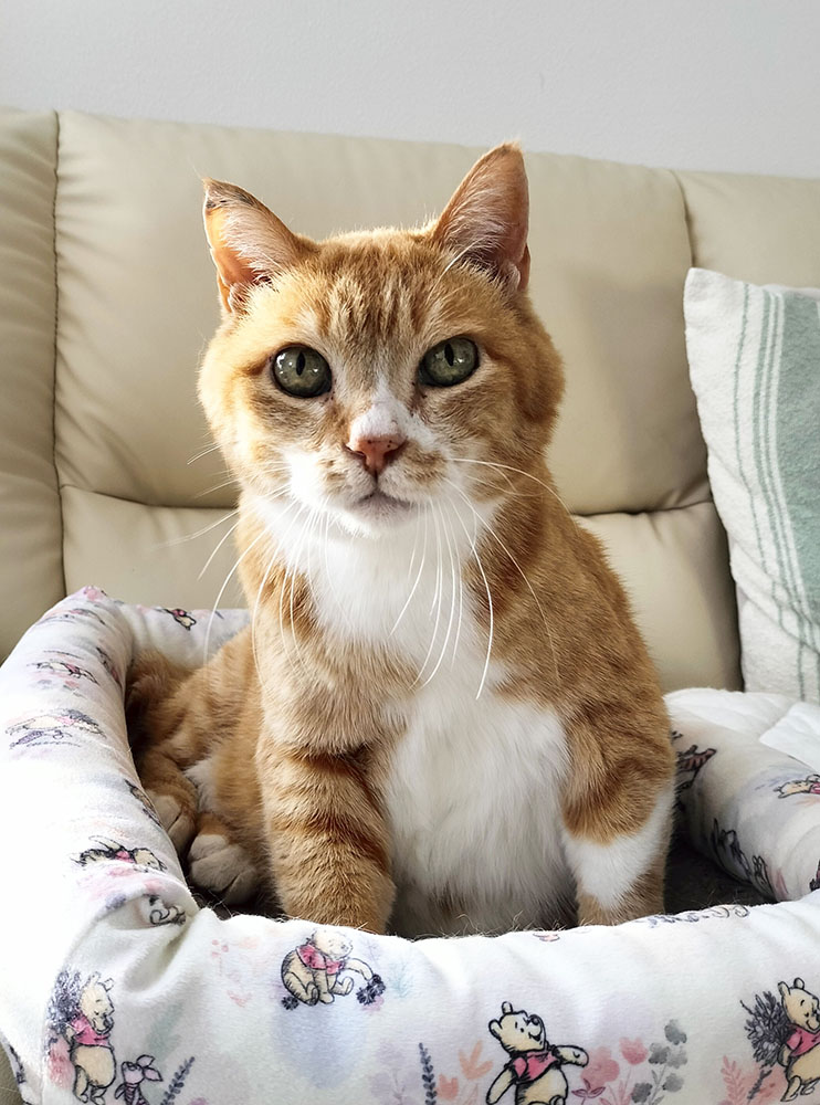 保護当初は緊張が強く、まるで石像のように固まっていましたが、最近はなでられると気持ちよさそうに目を細めるなど、少しずつ心を開いてくれています。