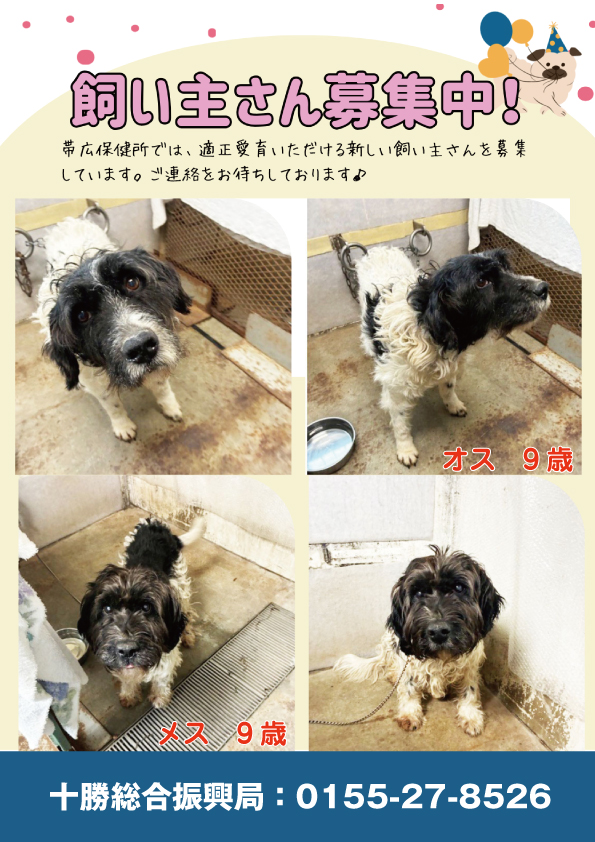 帯広保健所では、飼い主に放棄された犬2頭が出会いを待っています。