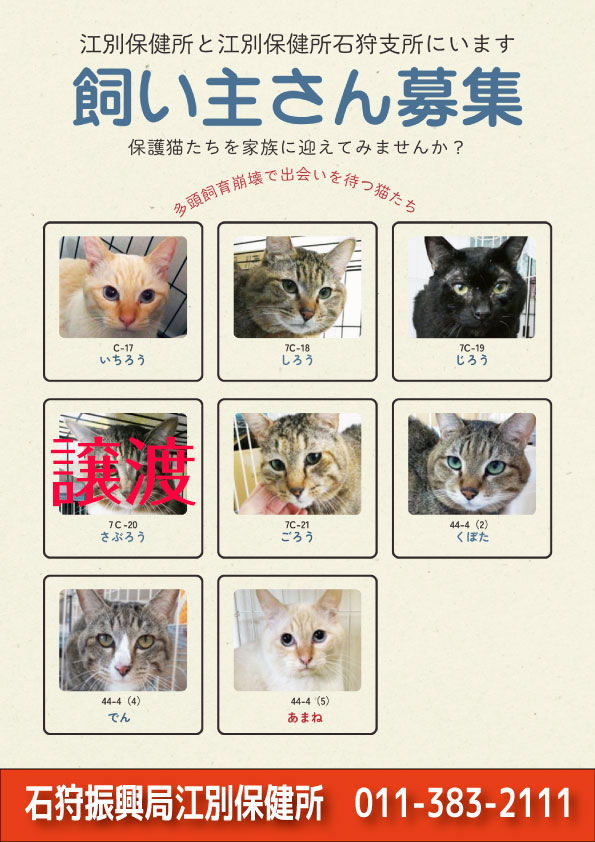 江別保健所と江別保健所石狩支所には、飼い主に放棄された7頭の猫たちが、新しい家族との出会いを待っています。