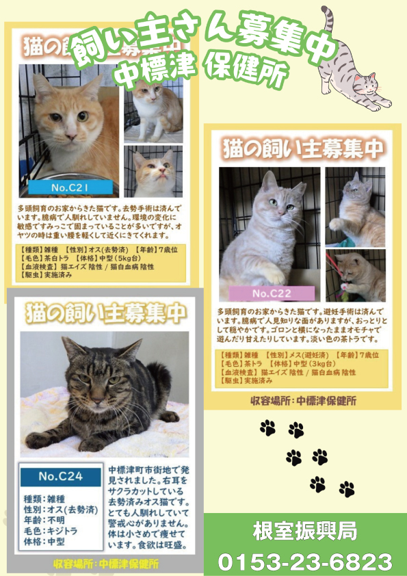 現在、中標津保健所には、3頭の猫たちが新しい家族との出会いを待っています。