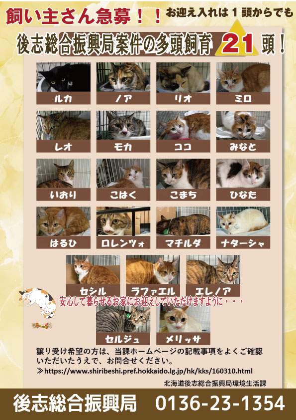 後志総合振興局では、管内の町で発覚した多頭飼育の現場から保護された21頭の猫たちが出会いを待っています。
