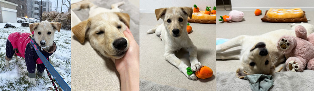 ひとり遊びも上手で、おもちゃで楽しそうに遊んでる姿が微笑ましいです。散歩は最初は慣れない環境で怖がる様子もありましたが徐々に慣れてきて今では楽しそうにルンルンで歩いてくれてます。