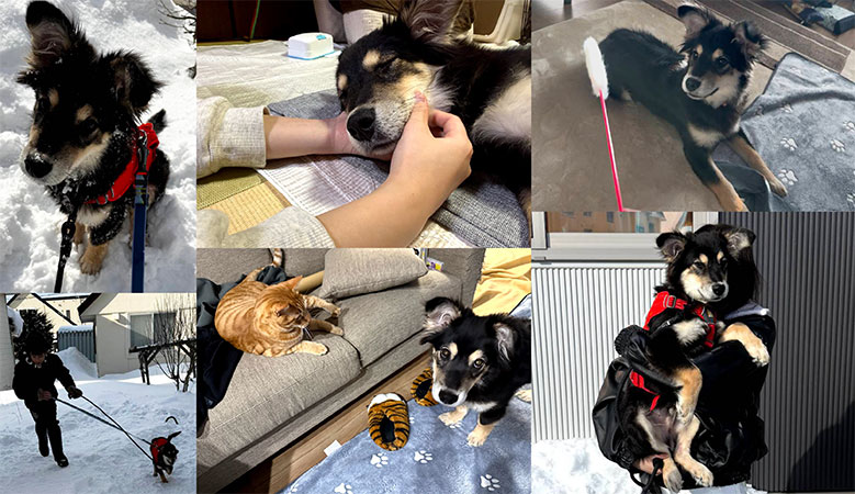 バロンちゃんの近況とても嬉しく拝見しました。1週間たった頃には、探検したり追いかけっこをしたりとお家に馴染んできましたね。トイレの成功で得意げな表情を見せる姿、可愛らしく微笑ましいです。先住猫さんたちと鼻挨拶までできているとのこと、安心いたしました。外では元気いっぱい雪遊びを楽しむ姿もバロンちゃんらしさが溢れていますね。予防接種でも落ち着いていられたのは成長を感じます。畜犬登録の件も承知しました。ご報告を心よりお待ちしております。