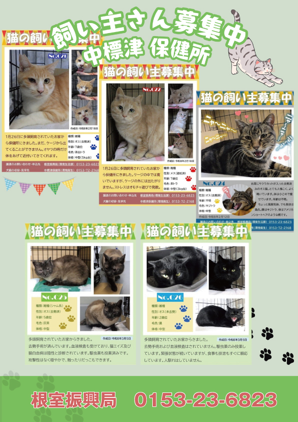 現在、中標津保健所には、5頭の猫たちが新しい家族との出会いを待っています。