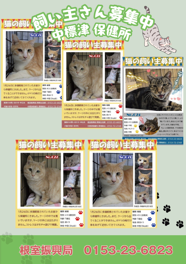 現在、中標津保健所には、5頭の猫たちが新しい家族との出会いを待っています。
