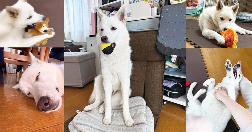 家ではおもちゃで遊ぶのが大好きで、次々とおもちゃ箱から出して遊んでいます。片付けてもすぐにまた取り出して楽しそうに遊んでいます。気がつくとおもちゃが水飲みに入っていることがよくあり、どうやら水飲みにおもちゃを入れるのが好きなようです。また、鳴るおもちゃで遊びながら遠吠えをすることもあり、遊び方が可愛くて思わず笑ってしまいます。